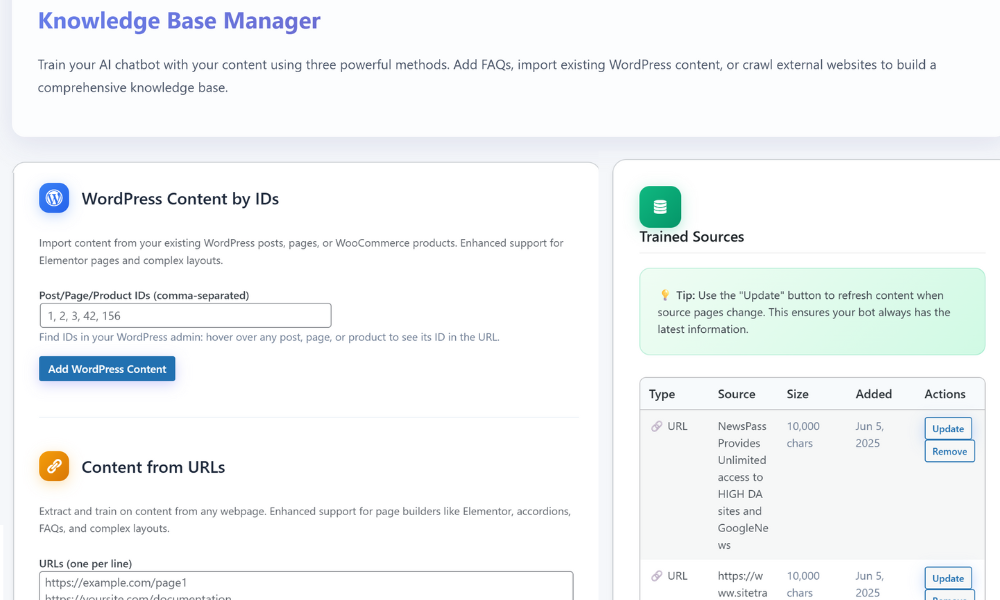 AI Live Chat PRO takes a different approach by allowing the chatbot to train directly from the website’s existing content without requiring that knowledge to be migrated elsewhere. This includes WordPress pages, FAQ sections, service descriptions, product details, and optional external documentation URLs. The training process follows a structured workflow that can usually be completed in under an hour, and because the chatbot reads directly from the website, updates to the site are reflected more seamlessly. This reduces administrative time and keeps the knowledge base centralized in one place.